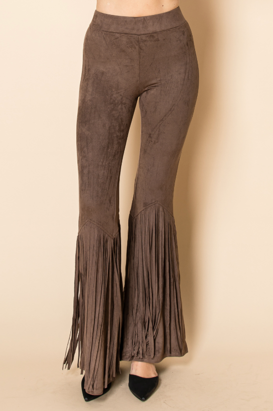 Channel vintage western vibes in these rich brown flare pants with dramatic fringe detailing. The faux suede texture and deep...