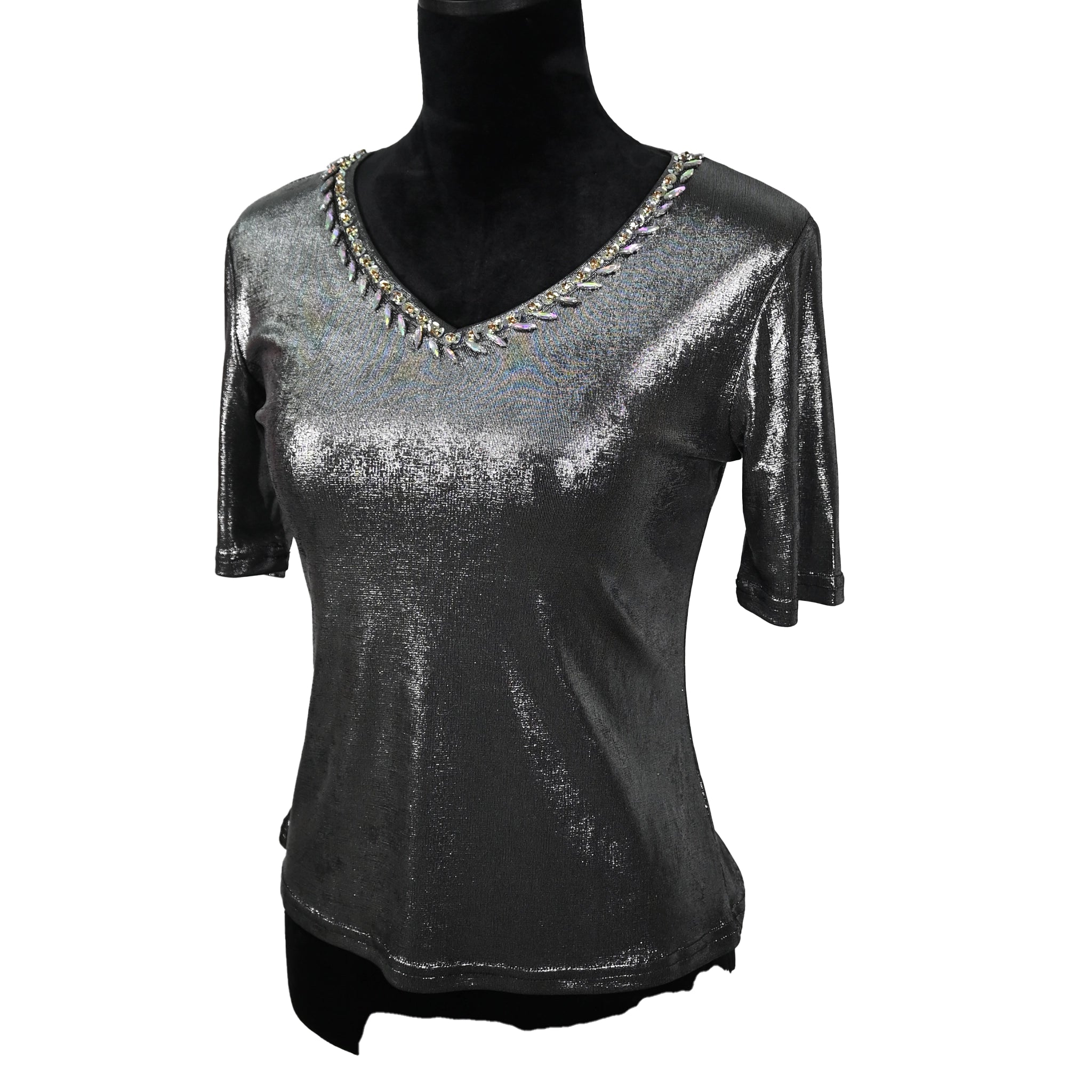 Short Sleeve Shimmer Silver Top with Gem Neckline