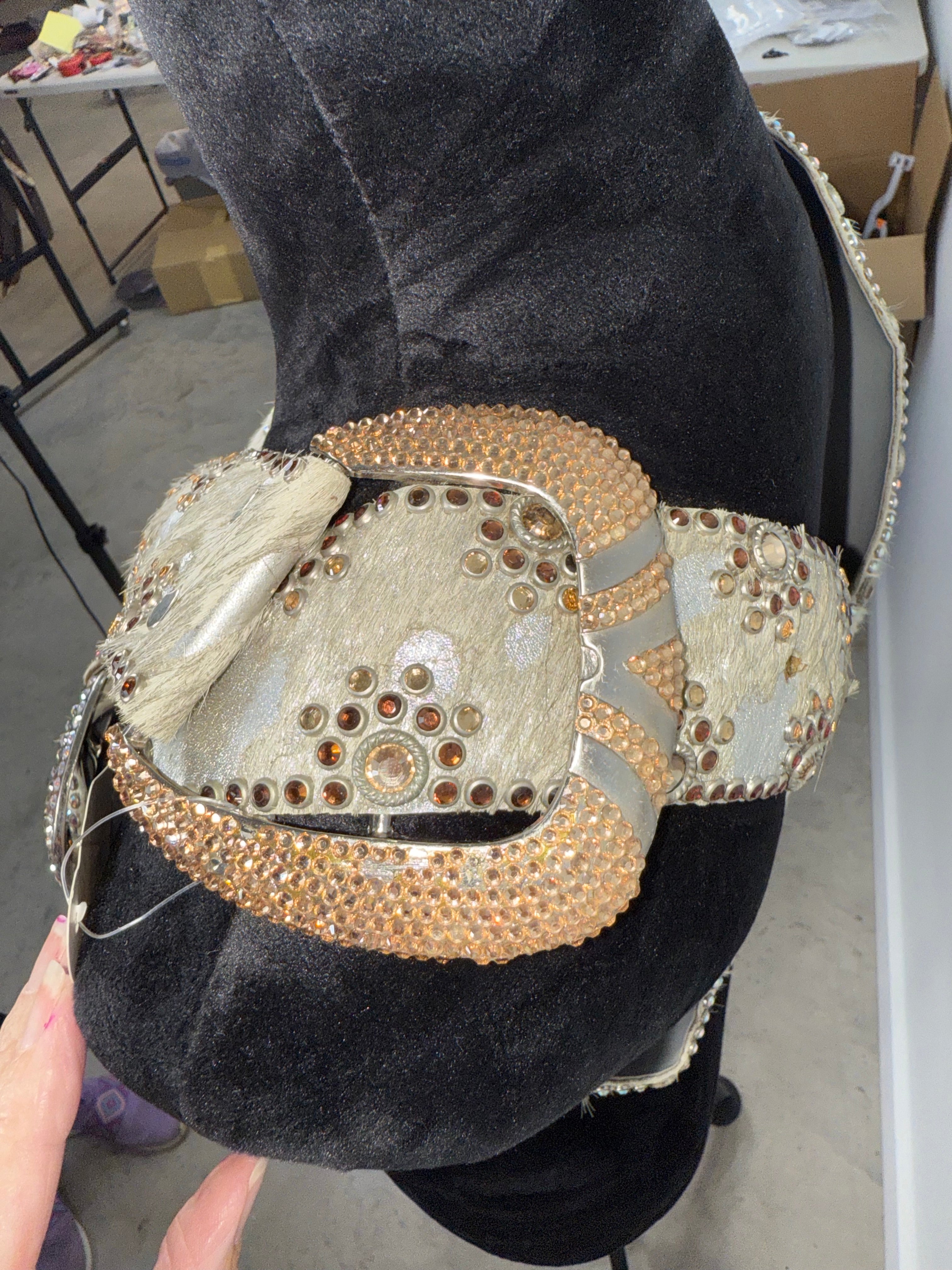 2.25 wide/silver lame acid wash top belt is a size 34" slv/bubble AWhh/lite colorado and smky topaz with point back...