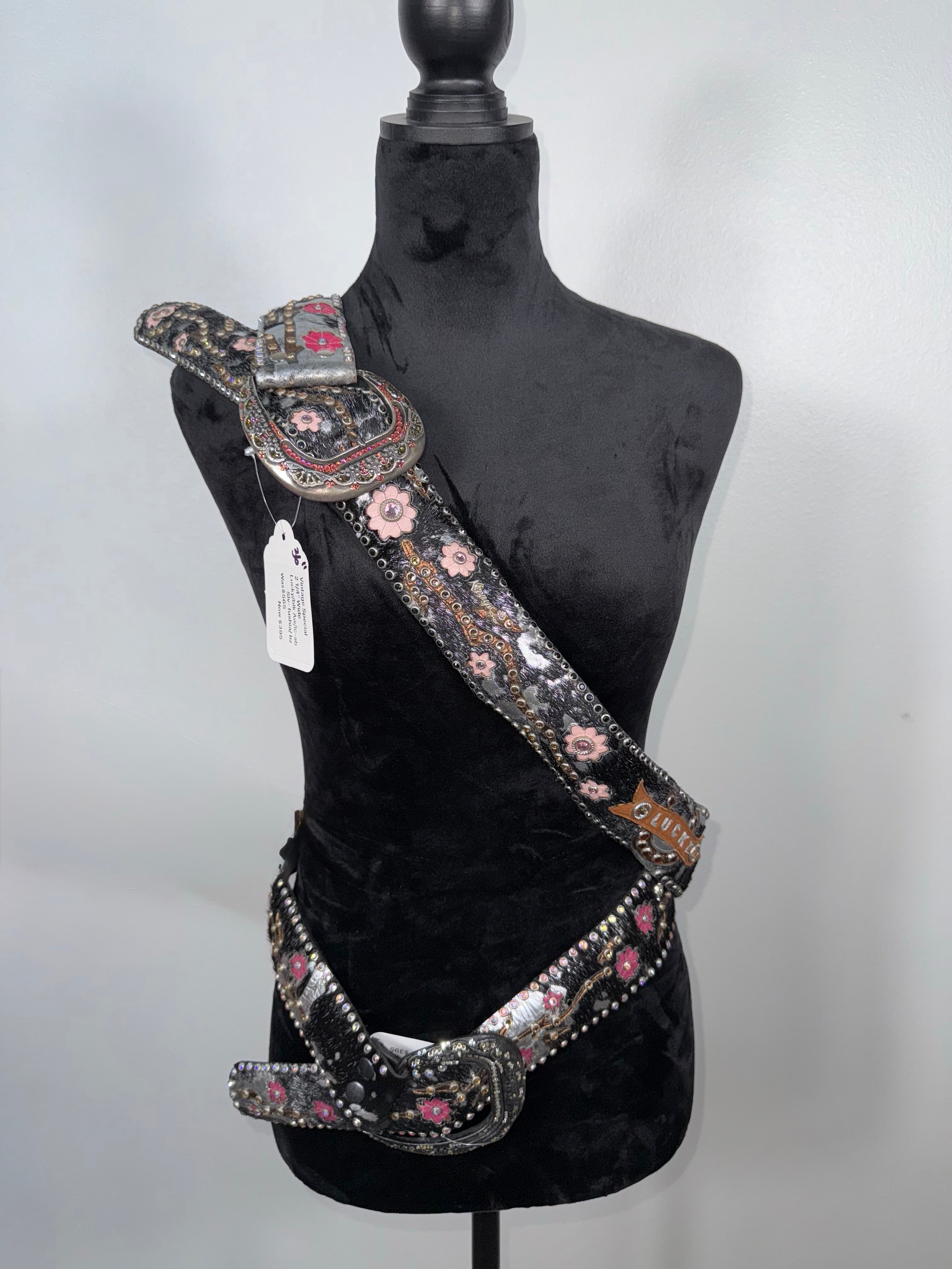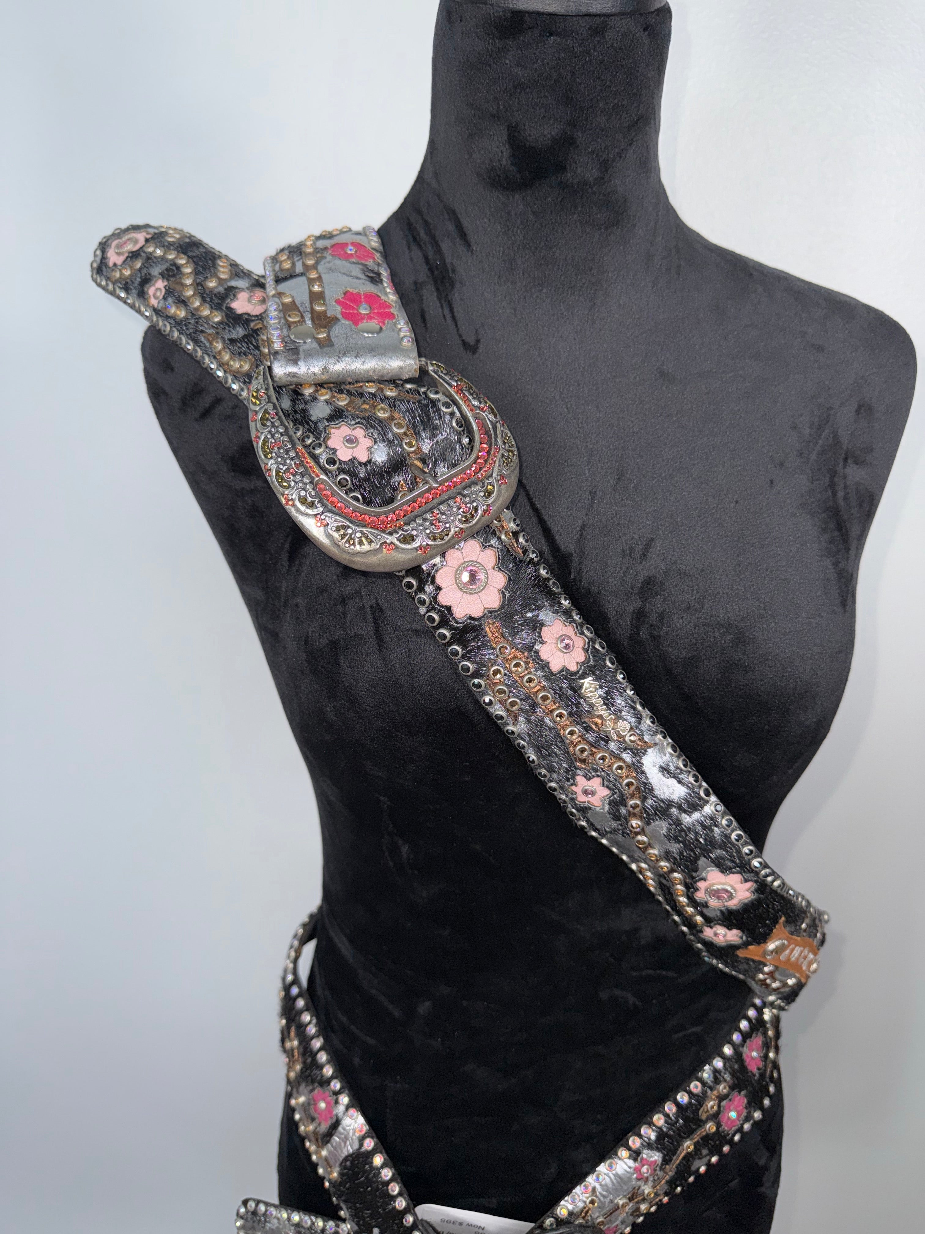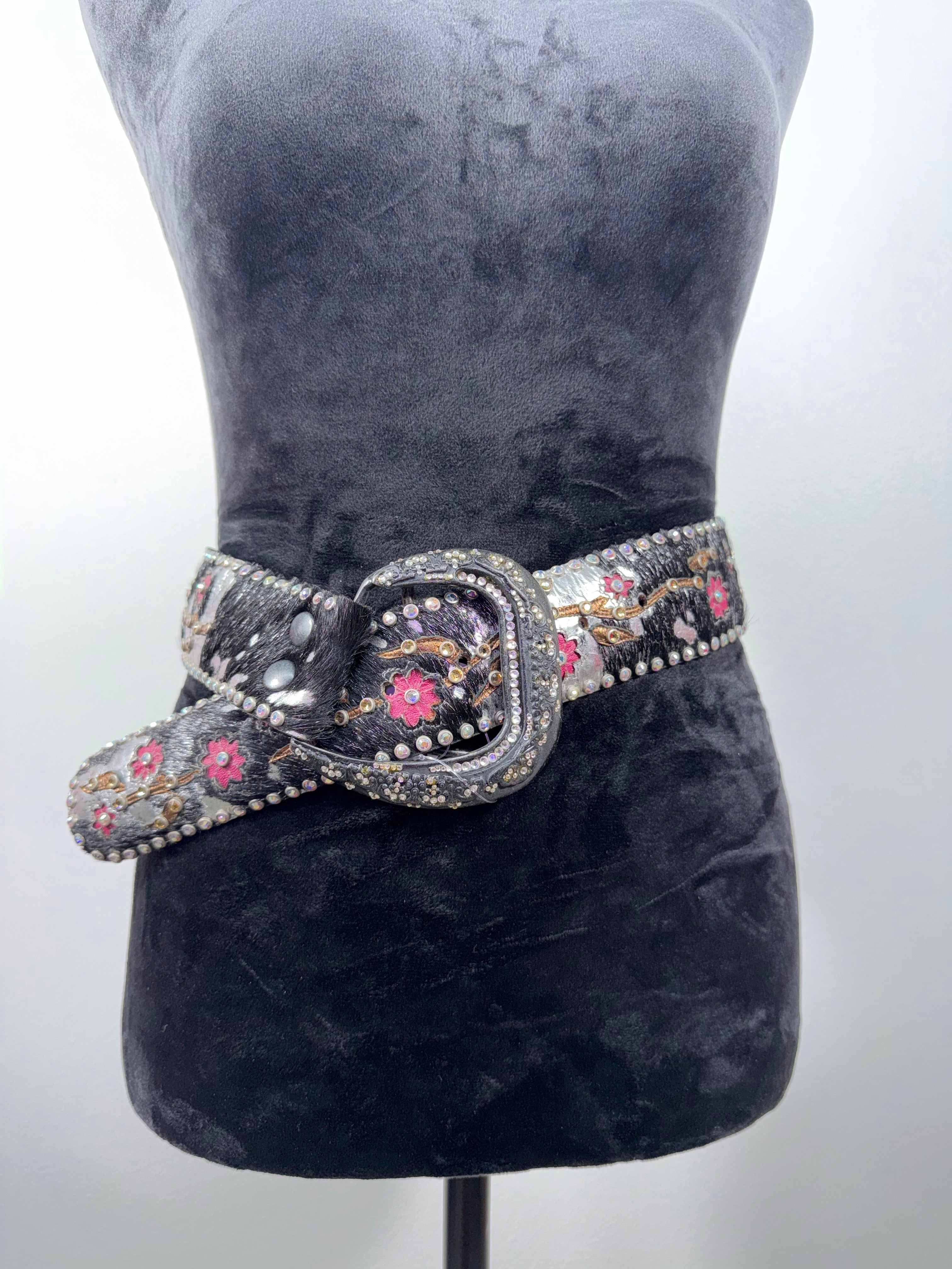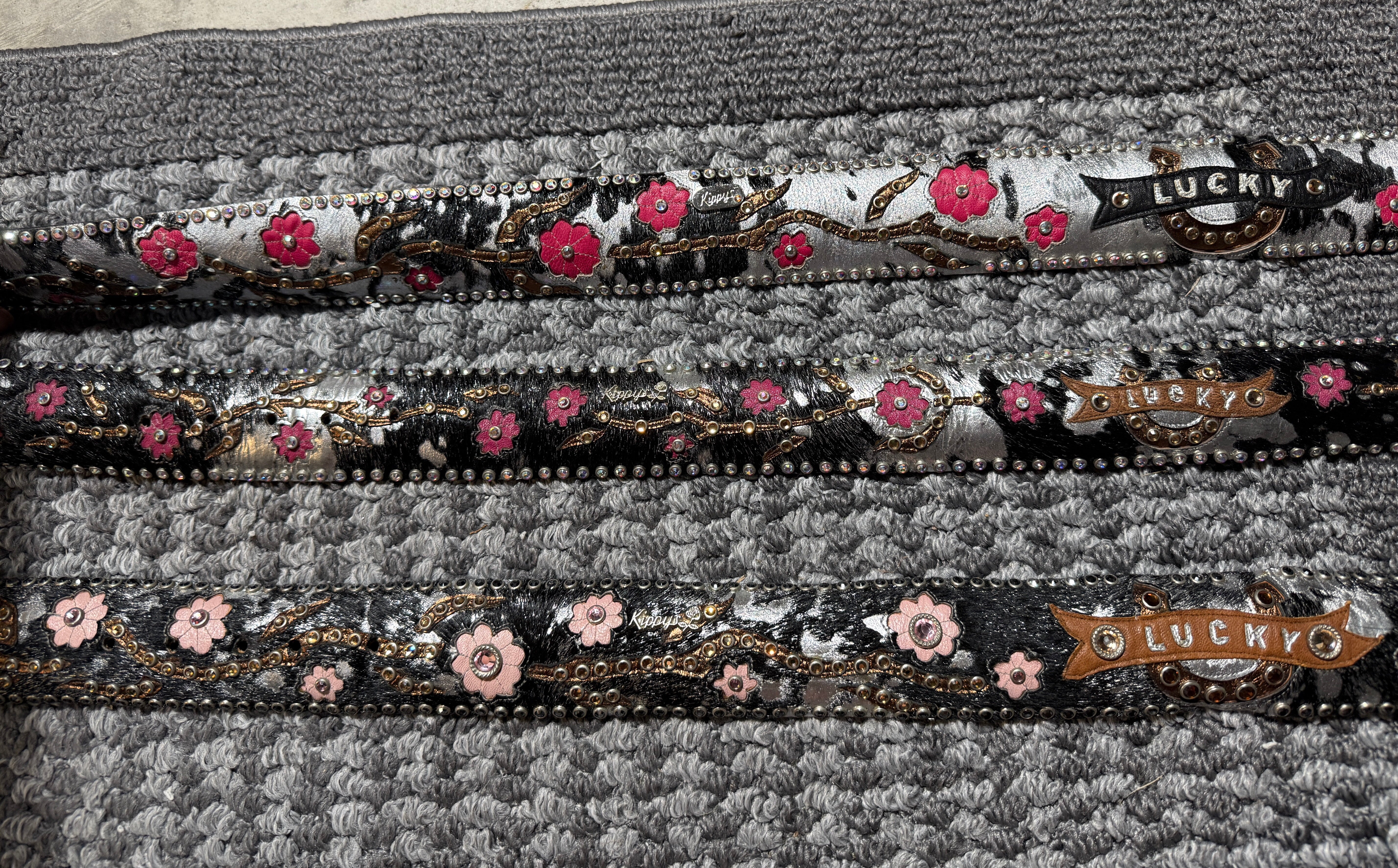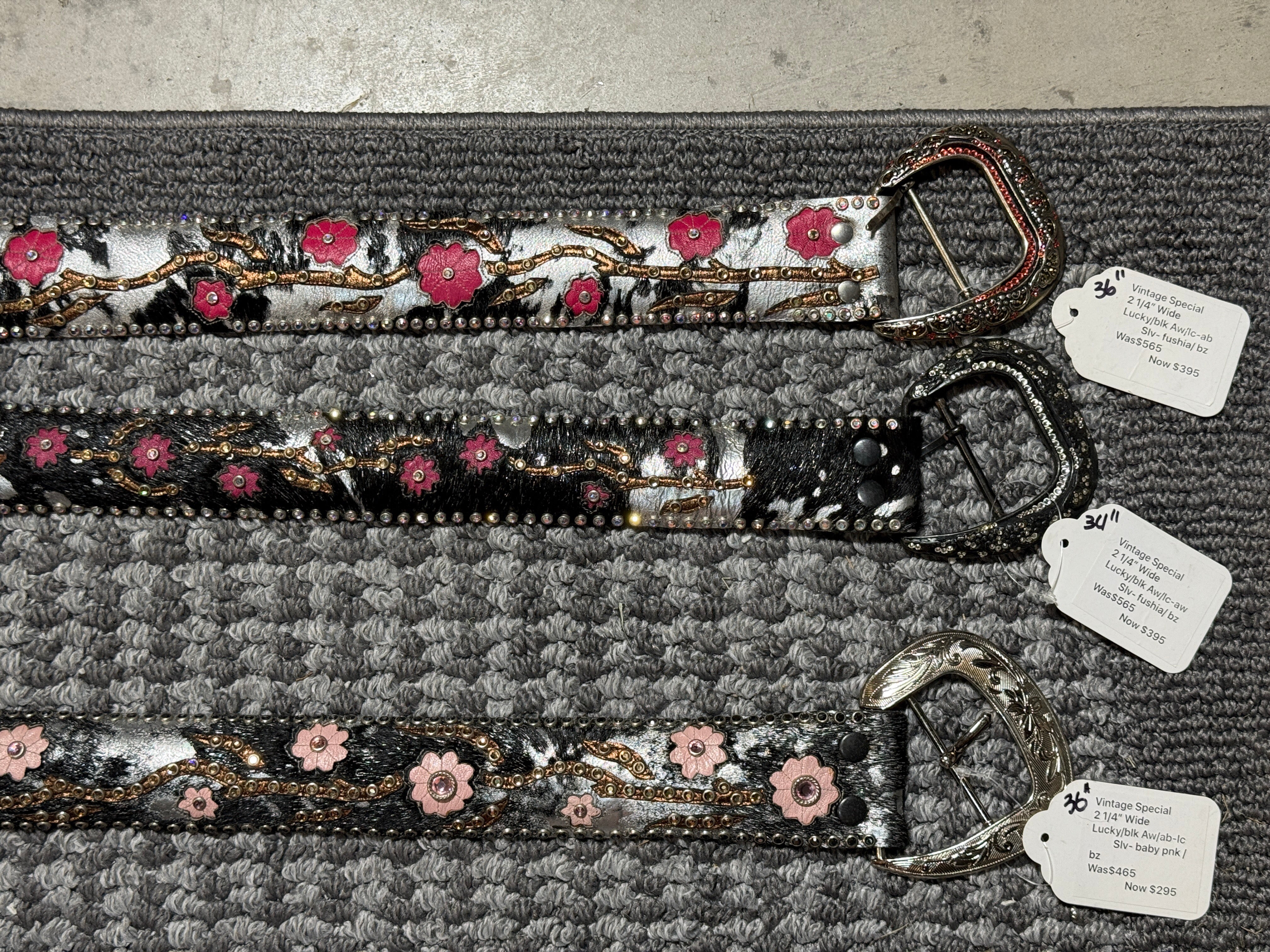 Lucky overlay with pinks, bronze and acid wash hairhide. In the pic with the 3 belts on the carpet: the...