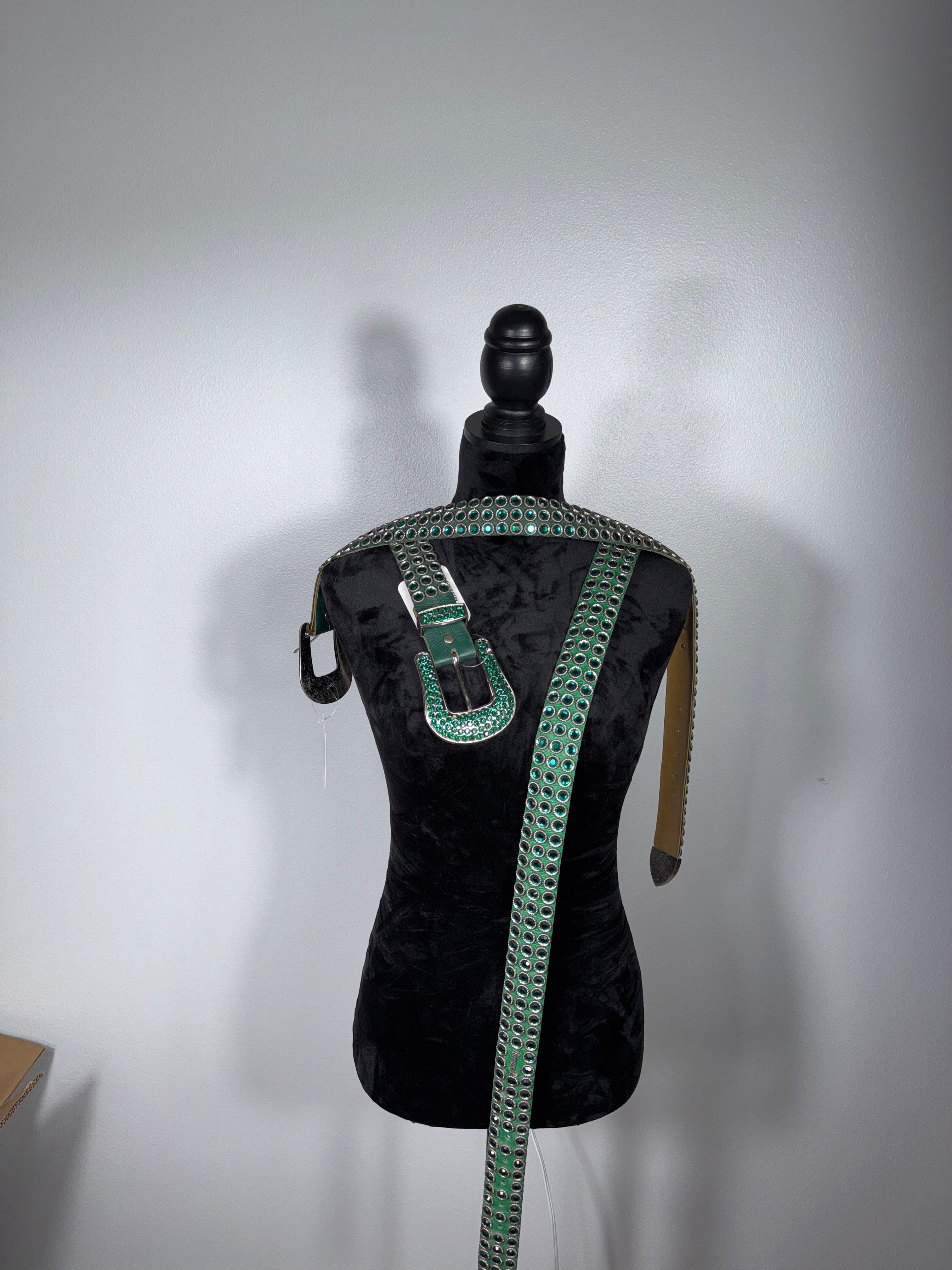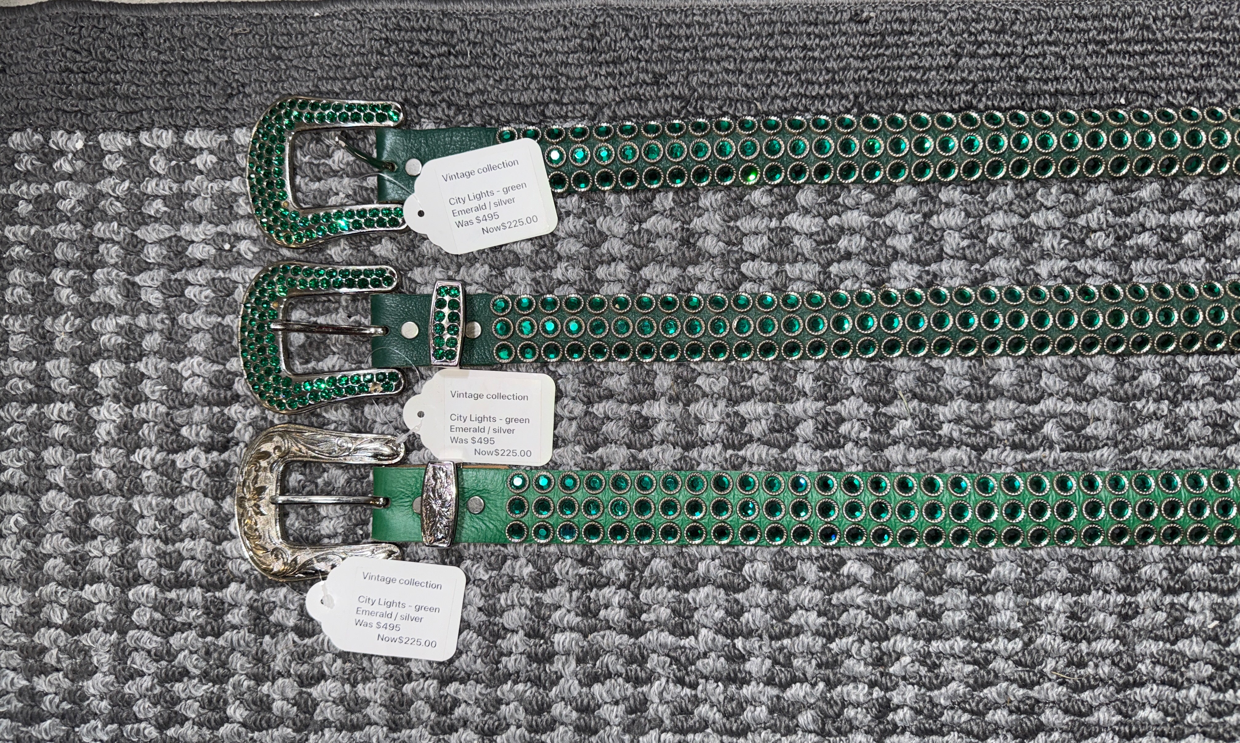 City lights- emerald green crystals, with silver rims. the top 2 belts have crystal buckles and a darker green leather. The...