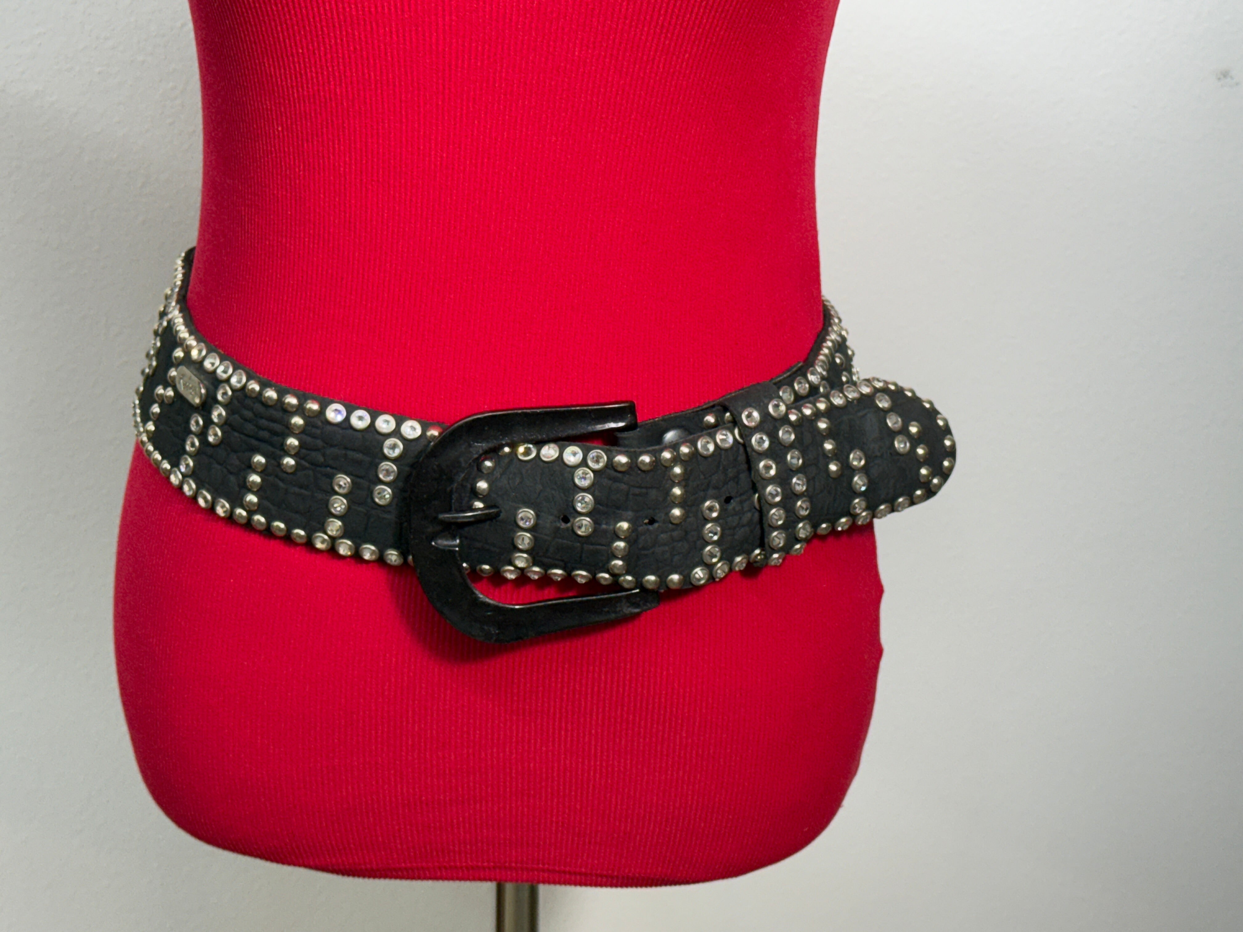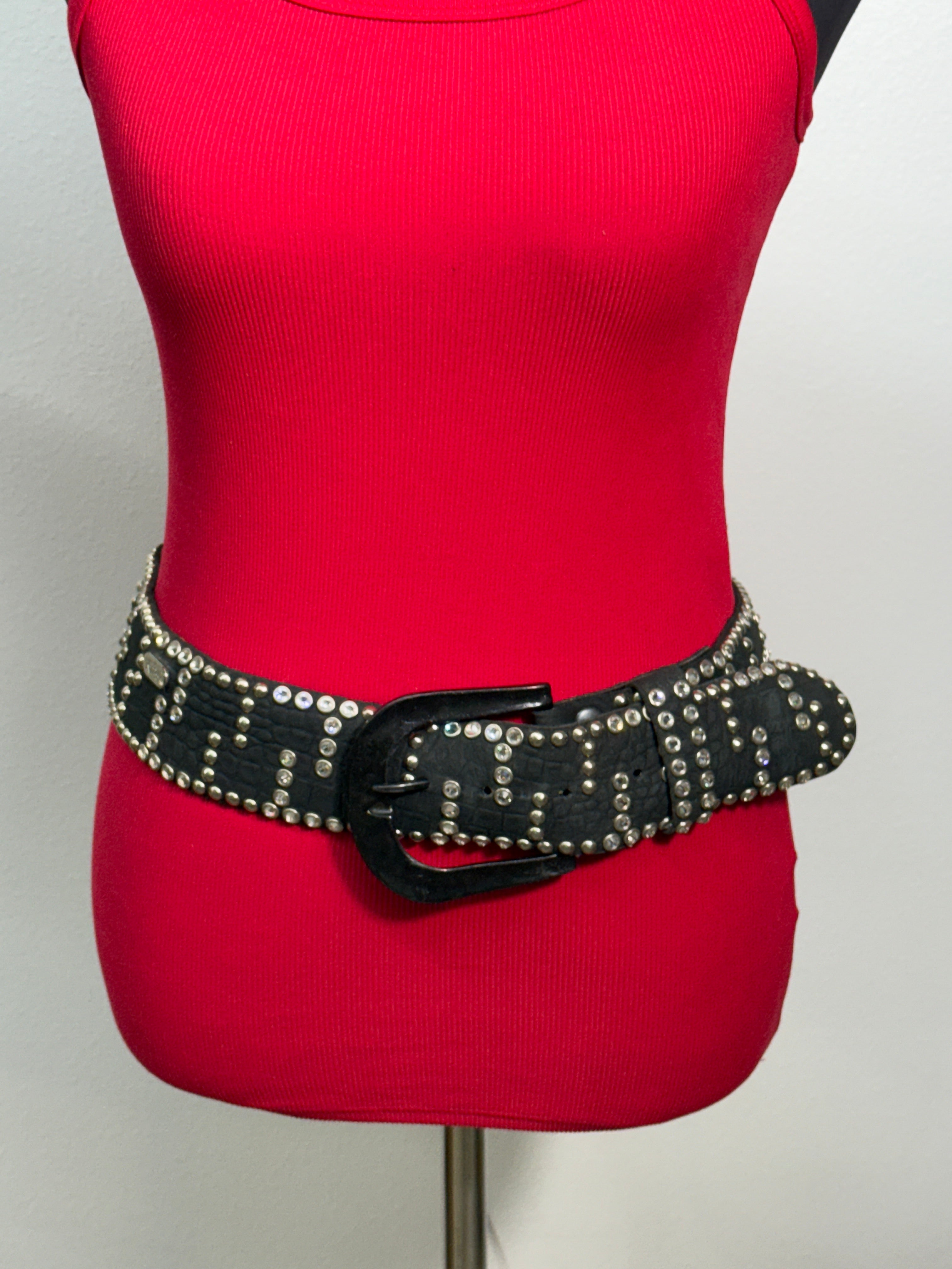 The Drop design: This is a curved belt, black leather, with clear crystals large hammered buckle. black / clear /...