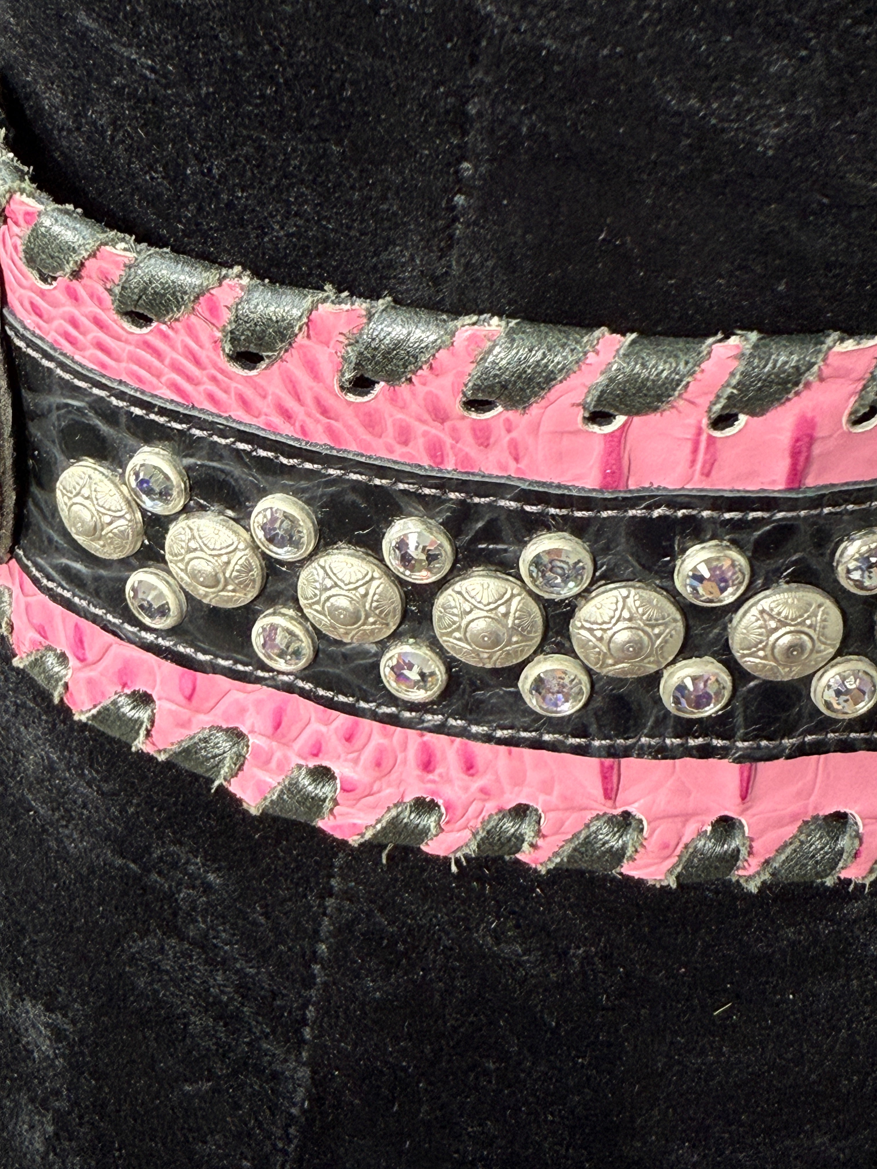 42" from the fold to the middle hole, Pink - black leather in croc print/ clear crystals/ round metal studs/...